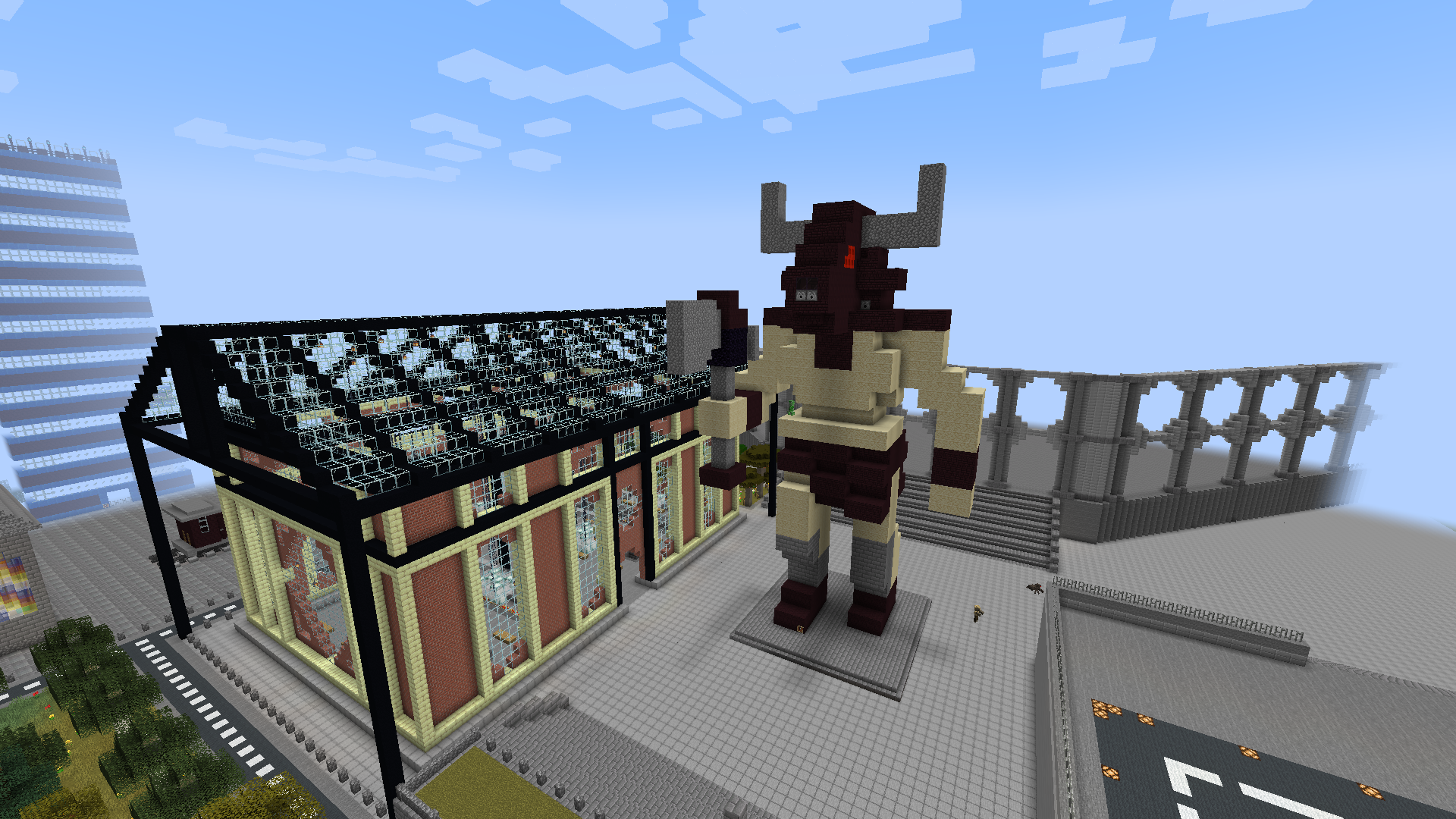 Center Šupkograda z Baumanovim nebotičnikom, Glavnim kolodvorom, kipom Minotavra in Šupkograjsko areno