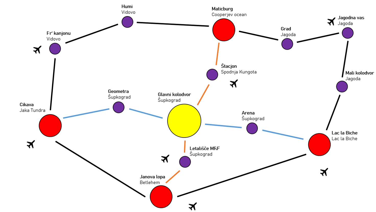 Mapa javnega prometa z označenimi železniškimi in zračnimi postajami